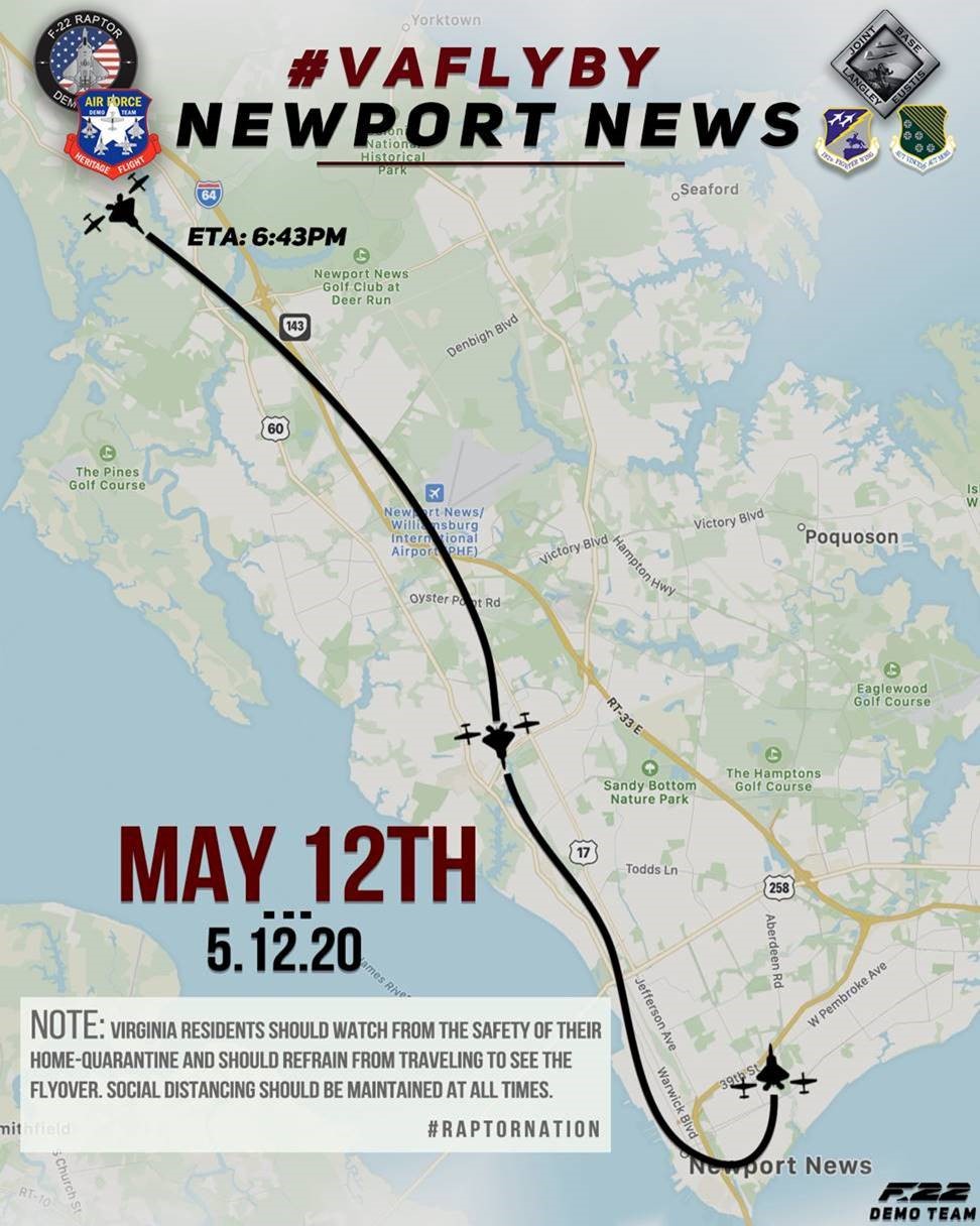 Residents are encouraged to watch the flyover from the safety of their home quarantine and should refrain from traveling. Remember to maintain social distancing at all times. Also, the times are subject to change or cancellation due to weather or maintenance. For more information, visit the Joint Base Langley-Eustis Facebook page.